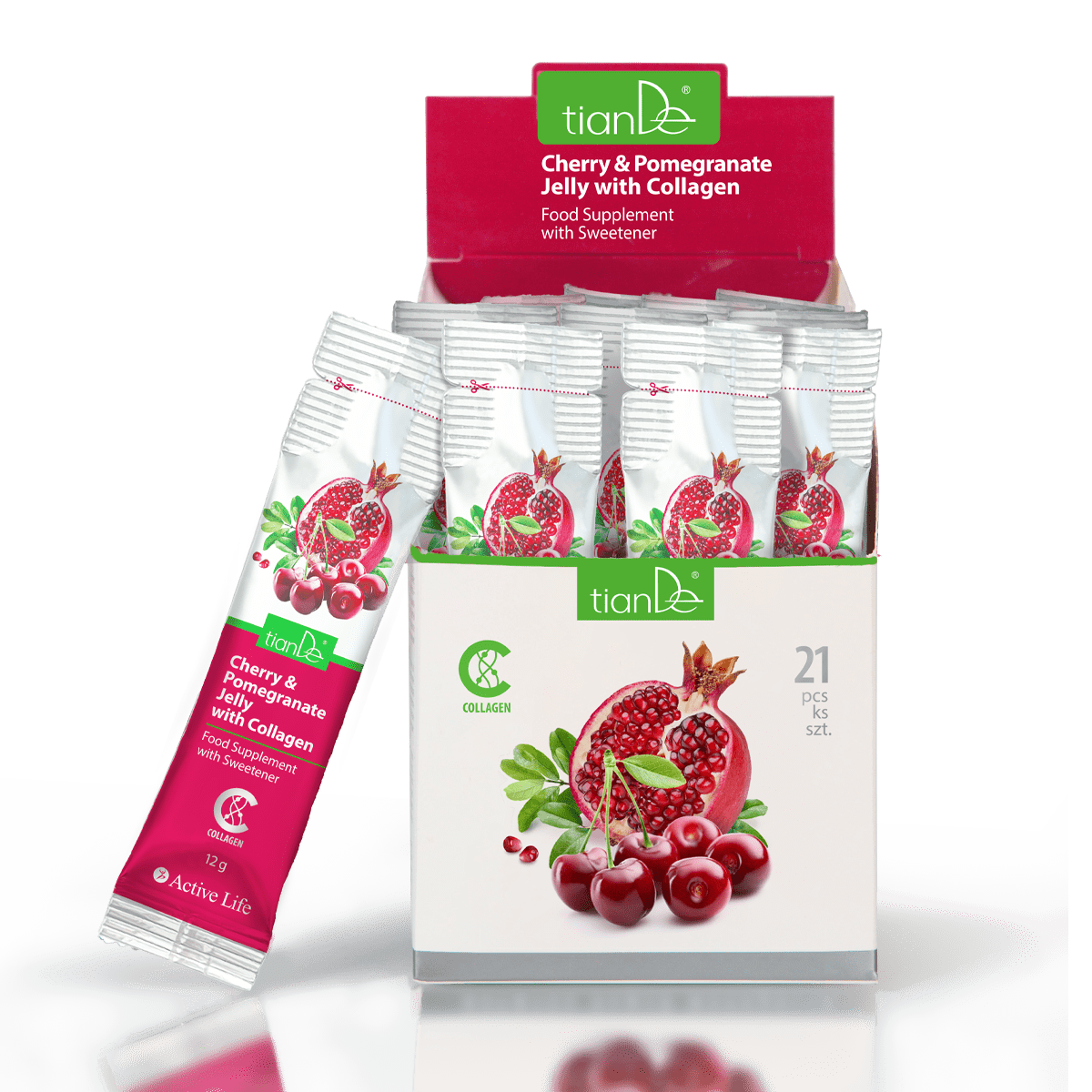 Skład: hydrolizowany kolagen (wołowy), sok z wiśni, woda, sok z granatu, substancja żelująca: pektyna; regulator kwasowości: kwas cytrynowy; substancja konserwująca: sorbinian potasu; substancja słodząca: glikozydy stewiolowe.